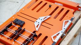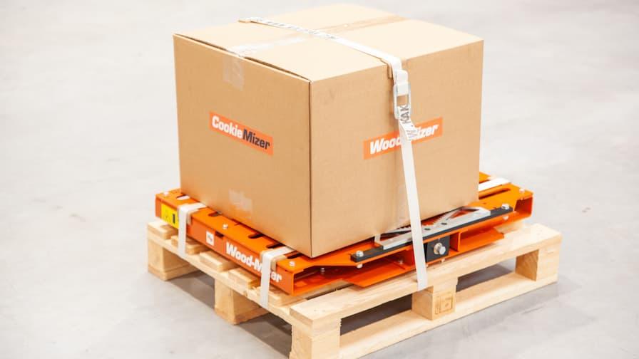 Přípravek CookieMizer Clamping se dodává na jedné paletě a se svými rozměry 890 x 735 x 118 mm a hmotností jen 72 kg, se opravdu snadno namontuje a seřídí na lože pily.