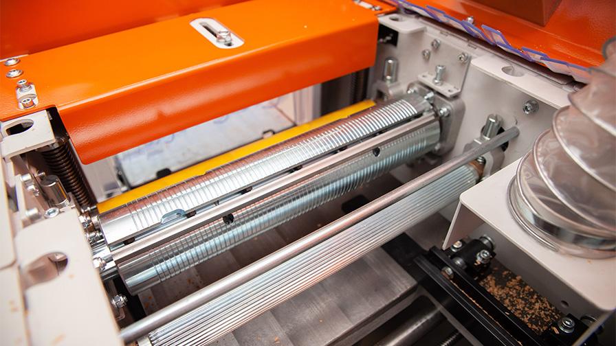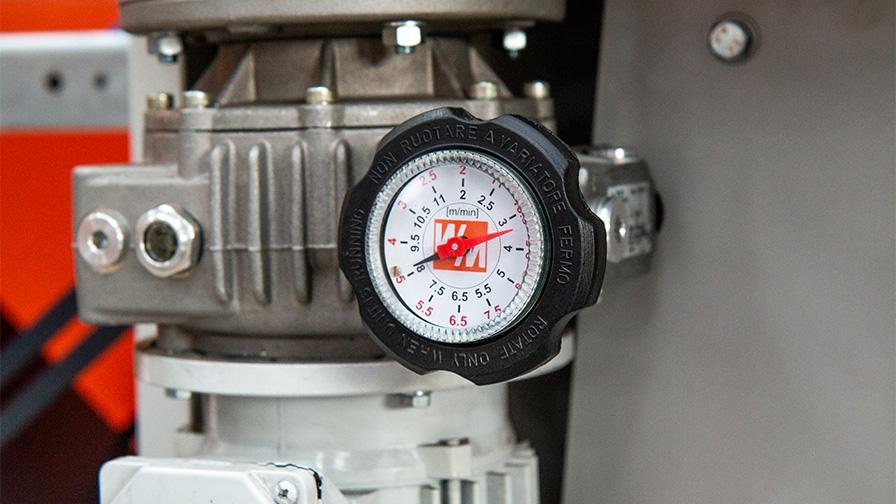 Podávací mechanizmus byl převzat z větší jednotky MP360 a dodává se s proměnnou rychlostí 3-15 m/min. Materiál se podává do stroje a odebírá ze stroje na stolech 1,2m s ochrannými ocelovými závěsy instalovanými nad vstupem podávání, aby se předešlo vržení materiálu zpět.